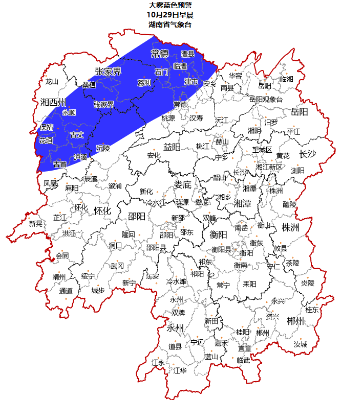 湖南省气象台10月28日16时发布大雾蓝色预警: