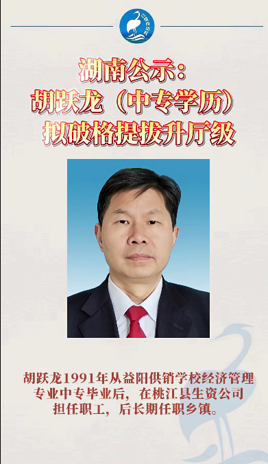 2016年,胡跃龙任益阳市两型办党组书记、主任,2019年任益阳市农业农村局党组书记、局长,2022年任益阳市发展改革委党组书记、主任,市粮食和物资储备局局长,后任益阳市发展改革委(市国动办)党组书记、主任、一级调研员,至此番拟破格提拔。