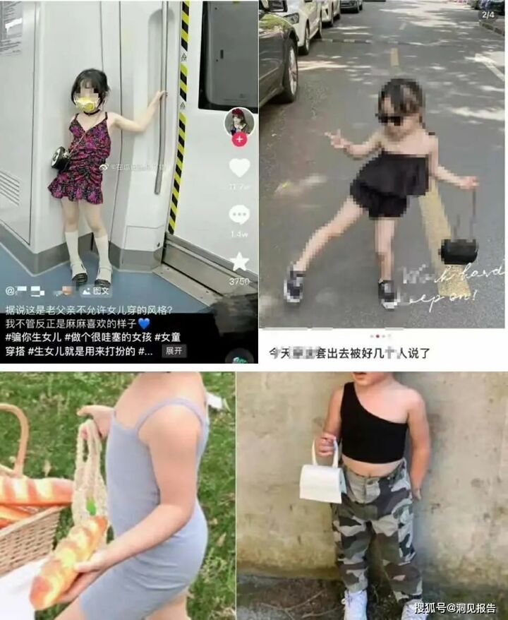 近日,在某视频社交平台中,一名年幼的女童戴着墨镜,身穿白色蕾丝花边吊带裙,搭配透明丝袜,脚踩高跟鞋正在热舞;另一篇贴子中,一名女童身穿紧身开衩设计的包臀连衣裙,手提小包,家长配文称“连衣裙超显身材,老母亲又被萌化了”。