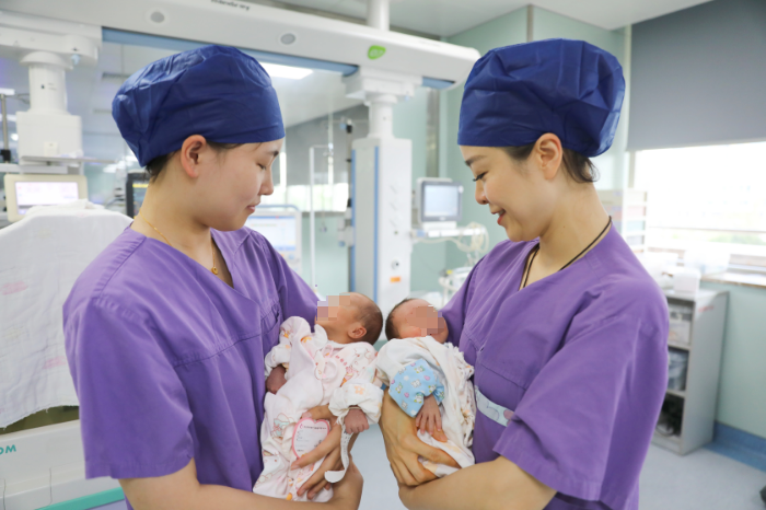在充分与产妇及家属沟通后,急诊剖宫产术快速启动。正如术前所料,由于产妇高龄、双胎及既往手术史,胎儿娩出后她出现了子宫收缩疲软、出血较多的情况。产科团队凭借丰富经验,果断、迅速施行宫腔纱条填塞术,有效控制住出血,为她保住了子宫。娩出的35周早产龙凤胎宝宝体重分别为1900克、1950克,随后新生儿科团队立即展开救治,将宝宝们转至NICU进一步治疗。