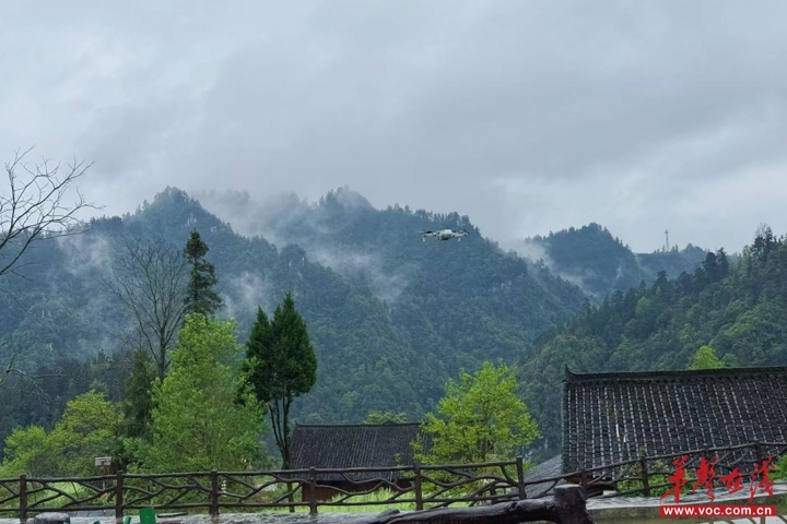 (龙先兰在家门口操控无人机探查蜂箱。王晴天摄)